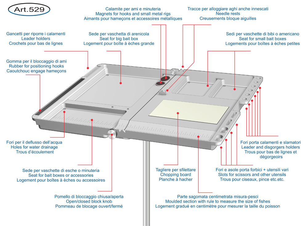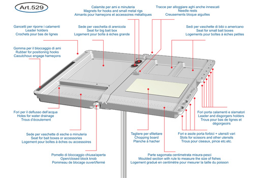 - Η βάση διαθέτει θήκες για κουτάκια δολωμάτων, φελλό για αγκίστρια, υποδοχές για παράμμαλα, σκληρό μέρος για κόψιμο δολωμάτων, θήκες για μονοδόλια/μάνες, μαγνητάκια για αγκίστρια ή μεταλικά rigs, μέτρο, καθώς και μέρη για το ψαλιδάκι την βελόνα ή τον απαγκιστρωτή!