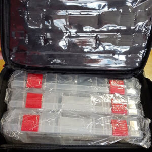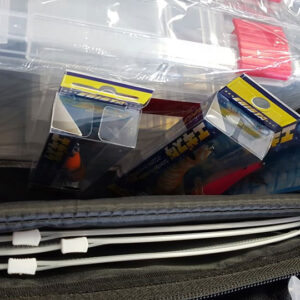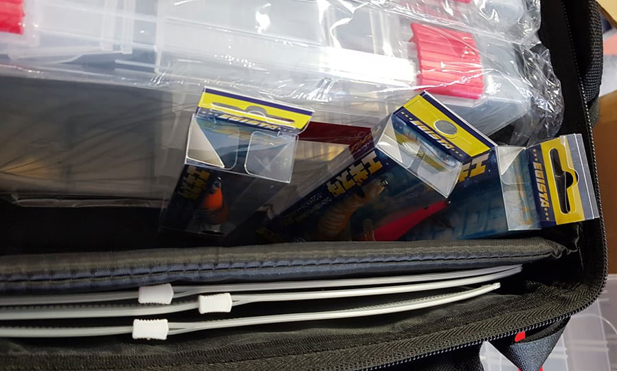 Εσωτερικά 3 πλαστικές θήκες με χωρίσματα καθώς και διαχωριστικό με χριτς/χρατς στο οποίο μπορουμε να τοποθετήσουμε καλαμαριέρες με τα κουτάκια τους ή στις ήδη 3 υπάρχοντες ναυλον θήκες σιλικόνες και οτιδήποτε άλλο. Στο καπάκι διαθέτει εσωτερική τσέπη για διάφορα αντικείμενα.