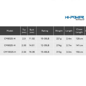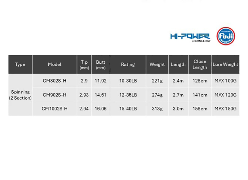 Model No Στελέχη Μήκος Μήκος Μετ. Βάρος Action CM802S-H 2 2.40mt 1.28mt 221gr max 100gr CM902S-H 2 2.70mt 1.41mt 274gr max 120gr CM1002S-H 2 3.00mt 1.58mt 313gr max 150gr