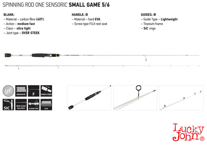 Πιο συγκεκριμένα είναι κατασκευασμένο από κορυφαία υλικά. Το υλικό κατασκευής του είναι carbon fiber (40T) εξαιρετικής ποιότητας, ικανό να μεταδόσει πολλές πληροφορίες στο χέρι μας κατά την διάρκεια του ψαρέματος. Τα περιφερειακά του ONE SENSORIC SMALL GAME 762ULMF εντυπωσιάζουν. Η Lucky John έχει επιλέξει να τοποθετήσει τους νέους οδηγούς της εταιρείας FUJI, που είναι μονής στήριξης τύπου “Ο”. Είναι κατασκευασμένοι από ΤΙΤΑΝΙΟ και το εσωτερικό τους είναι από SIC υλικό ενώ ανήκουν στην σειρά AT της εταιρείας FUJI. Η βάση του μηχανισμού είναι επίσης της εταιρείας FUJI δίνοντας μας την σιγουριά για το πολύ δυνατό κράτημα του μηχανισμού μας στο καλάμι. Είναι τοποθετημένο σε αυτήν ποιοτικό υλικό EVA ώστε να μην γλιστράει από τα χέρια μας το καλάμι κατά την διάρκεια του ψαρέματος. Βιδώνει από πάνω προς τα κάτω με αποτέλεσμα να μη ξεβιδώνει εύκολα κατά την διάρκεια των πολλαπλών Jerks-Twitches που απαιτεί η τεχνική.