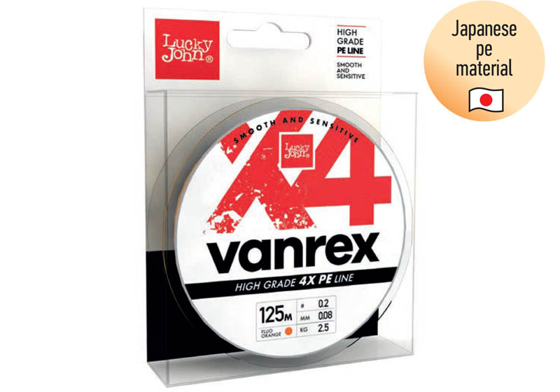 Όπως γνωρίζουμε η Lucky John είναι μία ολοκληρωμένη εταιρεία, έτσι από την συλλογή της δεν θα υπήρχε περίπτωση να λείπουν τα νήματα. Η πλέον οικονομική αλλά ποιοτική πρόταση της εταιρείας είναι το 4-κλωνο νήμα με ονομασία VANREX X4. Η όσο το δυνατόν στρογγυλή του διατομή σε συνδυασμό με την ολισθηρή επιφάνεια του νήματος, λόγω της διακριτικής του επικάλλυψης από κερί, έχουν ως αποτέλεσμα να πετυχαίνουμε πολύ μακρινές ρίψεις των τεχνητών δολωμάτων μας χρησιμοποιώντας το. Η πλέξη του αποτελείται από τέσσερις κλώνους Ιαπωνικού πολυαιθυλενίου ( JAPANESE PE MATERIAL ). Θα το βρείτε σε συσκευασία των 125 μέτρων. Οι διαστάσεις που είναι διαθέσιμο είναι σε μεγάλη ποικιλία ικανές να καλύψουν κατηγορίες από LRF μέχρι και Heavy spinning. Το χρώμα του είναι πράσινο. Τα ιδιαίτερα χαρακτηριστικά του είναι: