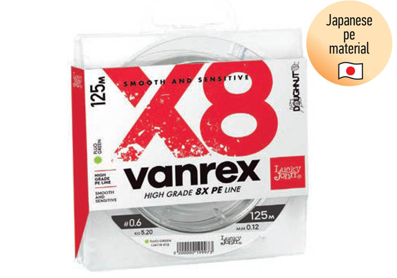 Όπως γνωρίζουμε η Lucky John είναι μία ολοκληρωμένη εταιρεία, έτσι από την συλλογή της δεν θα υπήρχε περίπτωση να λείπουν τα ποιοτικά νήματα. Η πλέον ποιοτική πρόταση της εταιρείας είναι το 8-κλωνο νήμα με ονομασία VANREX X8. Η στρογγυλή του διατομή σε συνδυασμό με την ολισθηρή επιφάνεια του νήματος, λόγω της διακριτικής του επικάλλυψης από κερί, έχουν ως αποτέλεσμα να πετυχαίνουμε πολύ μακρινές ρίψεις των τεχνητών δολωμάτων μας χρησιμοποιώντας το. Η πλέξη του αποτελείται από οκτώ κλώνους Ιαπωνικού πολυαιθυλενίου ( JAPANESE PE MATERIAL ) που το τελικό τους αποτέλεσμα είναι η ολοστρόγγυλη διατομή του νήματος. Θα το βρείτε σε συσκευασία των 125 μέτρων. Οι διαστάσεις που είναι διαθέσιμο είναι σε μεγάλη ποικιλία ικανές να καλύψουν κατηγορίες από Light Spinning μέχρι και Medium spinning. Το χρώμα του είναι FLUO πράσινο, δηλαδή πολύ έντονο ανοιχτό πράσινο. Τα ιδιαίτερα χαρακτηριστικά του είναι: