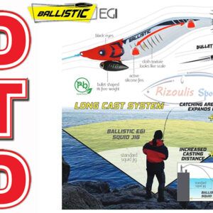 Εντυπωσιακή καλαμαριέρα για ψάρεμα καλαμαριών από την ακτή, η Ballistic Full Color Egi διαθέτει νέου τύπου εξωτερικό βαρύδι σε σχήμα σφαίρας και σκληρό σώμα, μεγάλης αντοχής, η επικάλυψη του οποίου παρομοιάζει τα φυσικά λέπια.