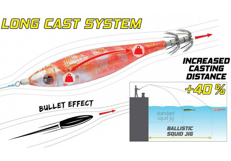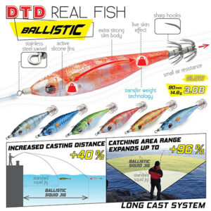 Οι καλαμαριέρες DTD Ballistic είναι μακράν οι πιο αποτελεσματικές σε επίτευξη μακρινής βολής και σας βοηθά να καλύψετε περισσότερη έκταση. Συγκεκριμένα, βάση μετρήσεων η βολή της υπολογίζεται κατά 40% μεγαλύτερη από τις καλαμαριέρες με εξωτερικό βαρίδι και αυτό συνεπάγεται την κάλυψη μεγαλύτερης επιφάνειας κατά 96%. Για να βελτιώσει ακόμα περισσότερο η DTD τη βολή, διαφοροποίησε την Real Fish σε σχέση με τη Bukva, με την προσθήκη φτερών σιλικόνης τα οποία βελτιώνουν την αεροδυναμική και την υδροδυναμική της καλαμαριέρας.