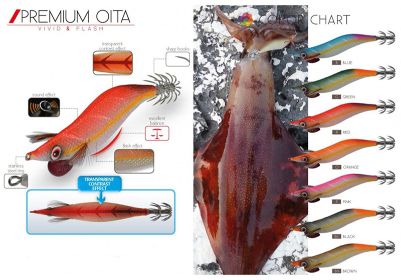 Η καλαμαριέρα Premium Oita διαθέτει εξαιρετικό φώσφορο και την καινοτομία Transparent Contrast Effect. Το όπλο αυτό της DTD, η πατέντα του «εφέ διάφανης αντίθεσης», φανερώνεται όταν κοιτάξετε την καλαμαριέρα στον ήλιο, αφού το σώμα της φαίνεται διάφανο, ενώ η ραχοκοκαλιά της είναι ιδιαίτερα έντονη.