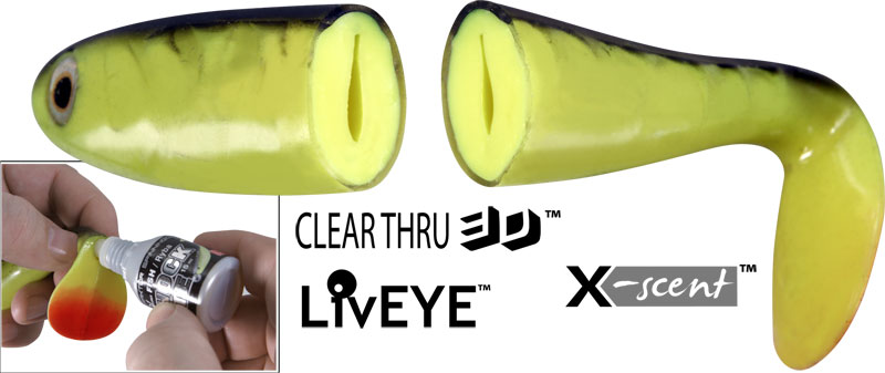 Εσωτερικό:Η τρύπα στο σώμα, που εκτείνεται σε όλο το μήκος του δολώματος, δίνει τη δυνατότητα ενός ποιό φωτεινού δολώματος (ιδίως στα διαφανή ψαράκια) ή την εισαγωγή υγρού αρώματος, η οποία σταδιακά θα διαφεύγει από την ουρά αφήνοντας στο νερό ερεθιστική μυρωδιά. X-Scent ™ σύστημα.